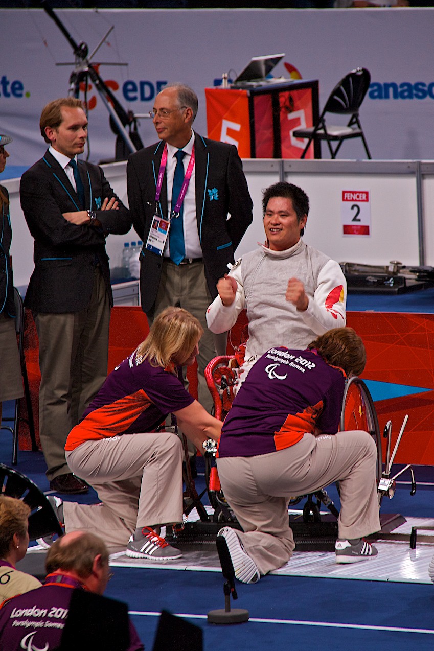 Sports commentators often talk about how much an athlete wants victory. If appearances are anything to go by there can be few athletes who "want it" as much as Daoliang Hu, Chinese paralympic fencer. In the Men's Individual Foil Category B, Hu fought for the gold medal against Anton Datsko from the Ukraine. Every point scored by Hu was greeted with clenched fists and loud cries, and from the cheers of the crowd it seemed as though this commitment was highly appreciated. Hu took the lead early on and looked like maintaining this. However, partway through the match Hu received a red card penalty, after which his composure seemed to go for a while and Datsko scored several points to draw level. Eventually though Hu's composure returned and he fought aggressively to take the gold medal. Even as he was wheeled from the arena Hu's face was contorted with emotion. From my seat in the audience I managed to get some pictures that captured this strength of feeling.